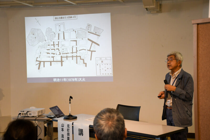 フォーラムは、講座、まち歩き、ワークショップの3本立て。函館景観まちづくり協議会事務局長を務める、センター長の仙石が司会を務め、元町倶楽部の山本真也さんより、大火を経た函館の街区整備やにぎわいの変遷について講義がありました。