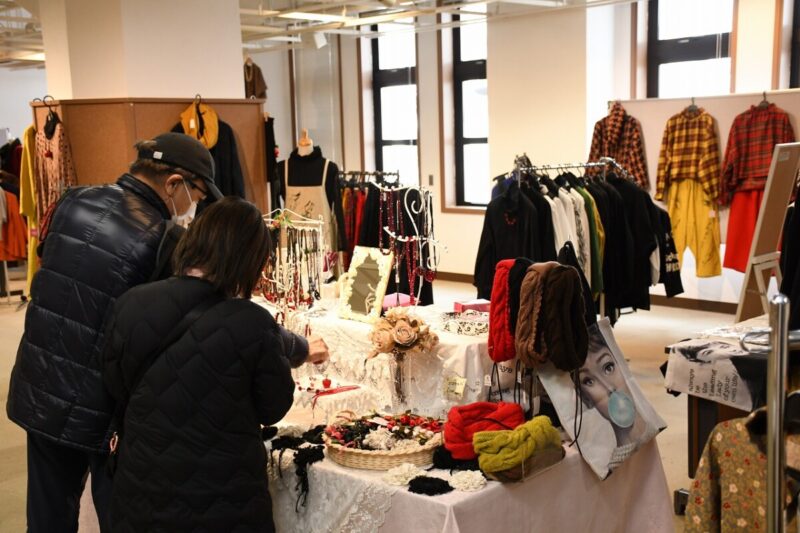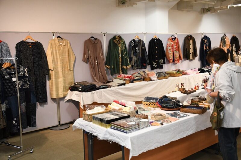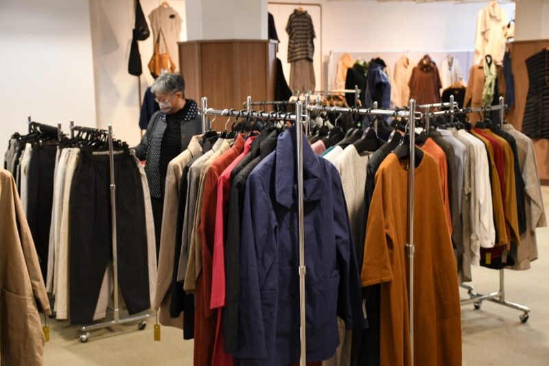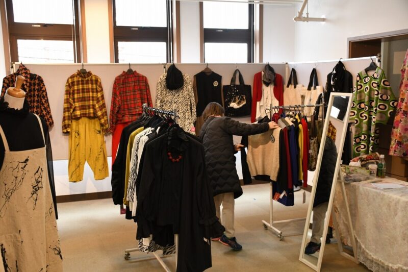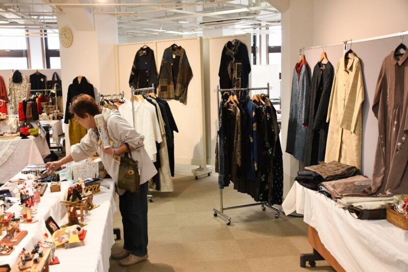 毎年春と秋の年2回まちづくりセンターで開催しているイベントです。会場では着物の生地などを再利用した洋服をはじめ、秋らしい色合いのシャツやジャケット、コートなどがずらりと並んでいます。