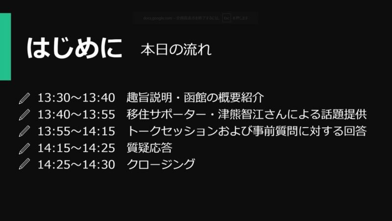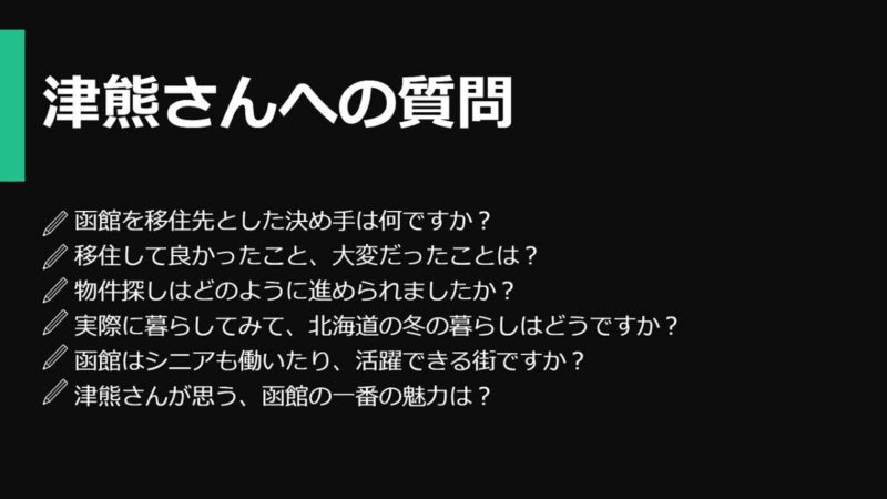 遠方にお住まいで函館市への移住を検討中の方々に、オンラインを通じて街の魅力を伝え、移住に向けた疑問の解消につなげてもらおうと、初めて企画しました。記念すべき第1回は函館市移住サポーターの津熊智江さんにご登壇いただきました。