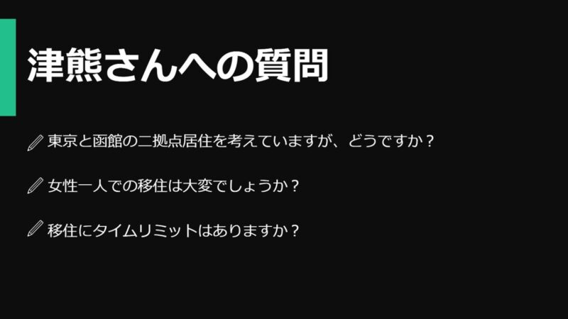 私は今回進行役として隣で津熊さんのお話を聞いていましたが、話題提供の冒頭でこれまでの移住経験を「旅をするように暮らす」と表現されていたのが印象的でした。観光地としての魅力満点の函館はその言葉がぴったりあてはまる街です。今後もセミナーを通じてさまざまな角度から函館の魅力や移住検討に役立つ情報を発信していきます!