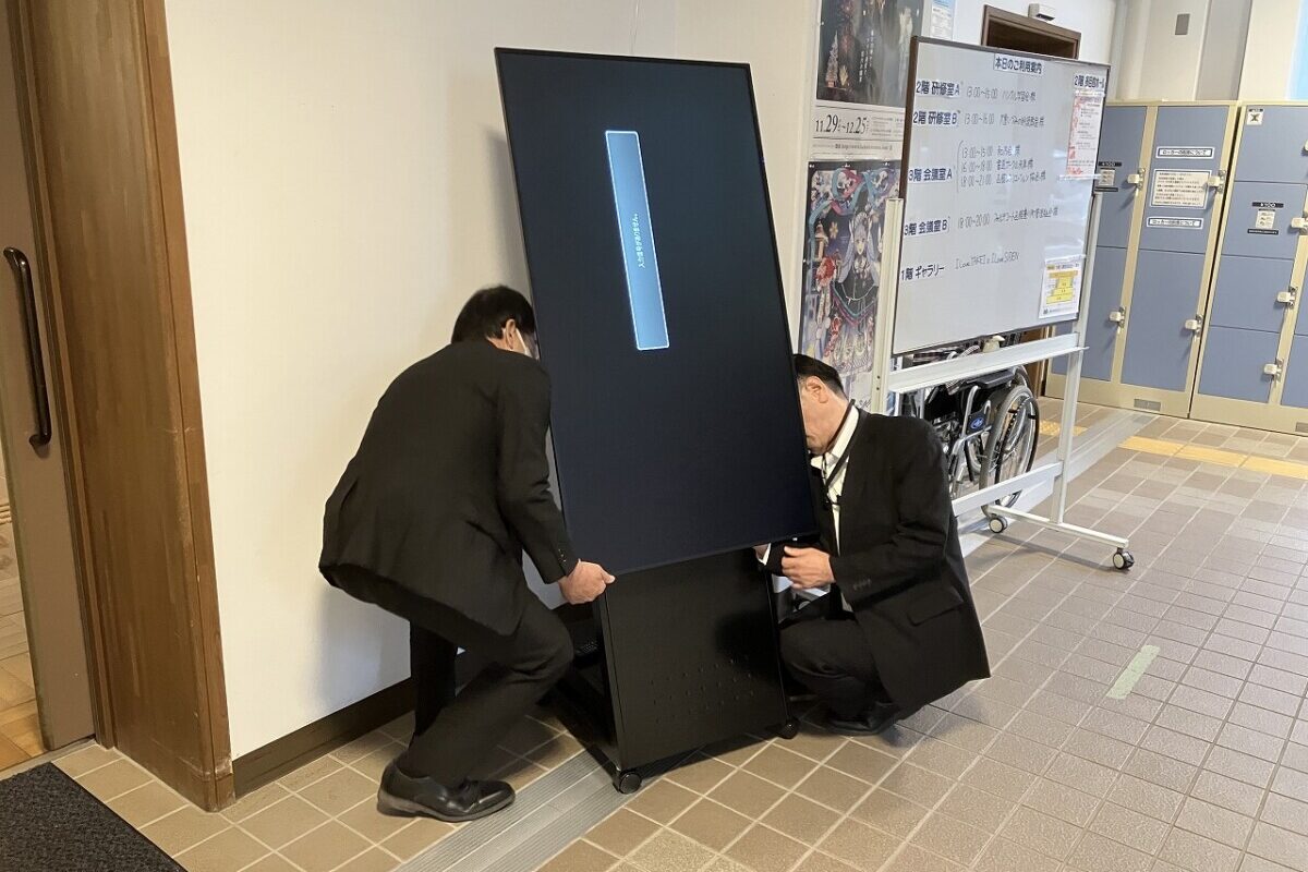 当日の貸室案内のほか、施設内で開催中のイベント情報、まちづくりセンターからのお知らせを表示しています。貸室案内はこれまでホワイトボードに手書きしていましたが、デジタルサイネージ導入で業務の効率化を図ります。1階ギャラリーや2階多目的ホールで開催中のイベント情報も表示し、市民活動情報のさらなる発信につなげます。