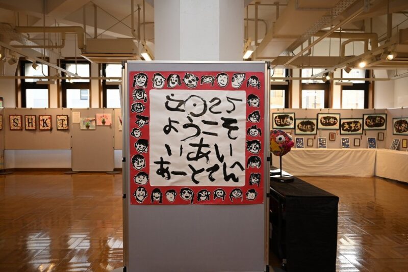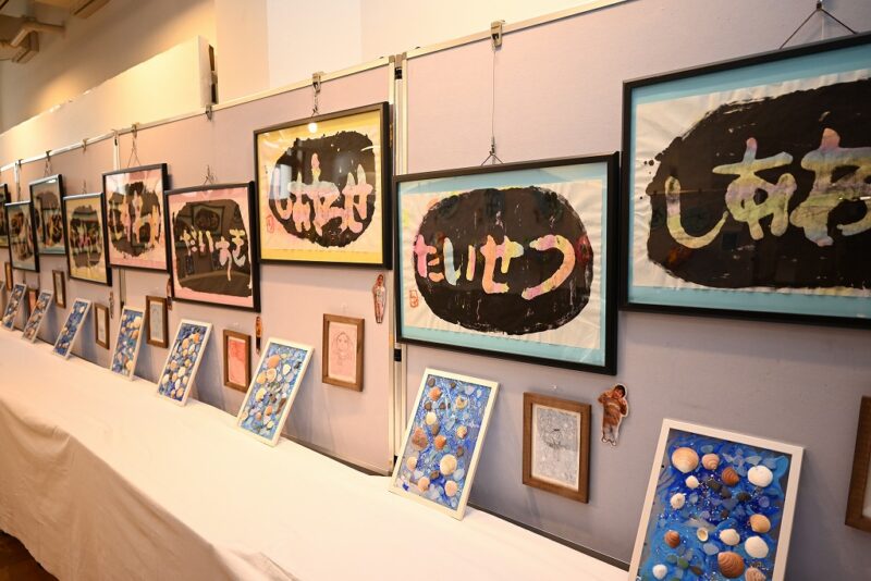 英語講師のラファエル・ガルシア先生、書道講師の佐々木明子先生(ATELIER SAKURA代表)の指導のもと、遺愛幼稚園の年中・年長さんが制作したアート作品が展示されています。