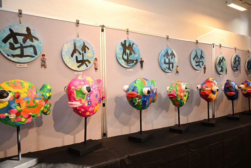 海辺の散策で見つけたシーグラスを使用した作品や、絵本「Rainbow Fish」を題材に作られた「自分だけのRainbow Fish」など、キラキラ・カラフルな力作が並んでいます!書道アートは、子どもたちの素直な感性がそのまま伝わってくるようです。どの作品からも子供たちの元気が読み取れて、見ているだけで活力が湧いてきます!