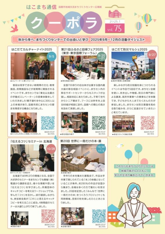 まちづくりセンターの広報紙「はこまち通信クーポラ」75号を発行しました。まちづくりセンター1階で配布中です。ご自由にお持ち帰りください。