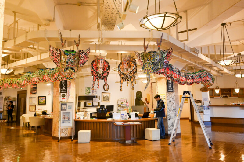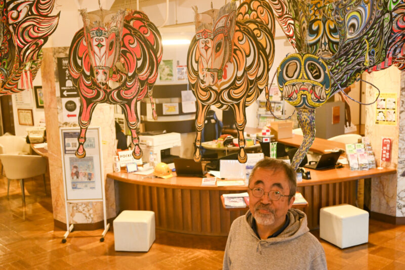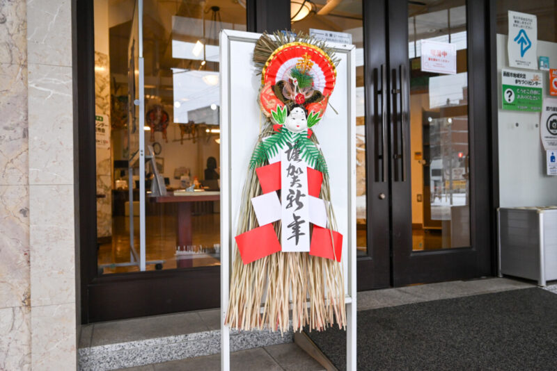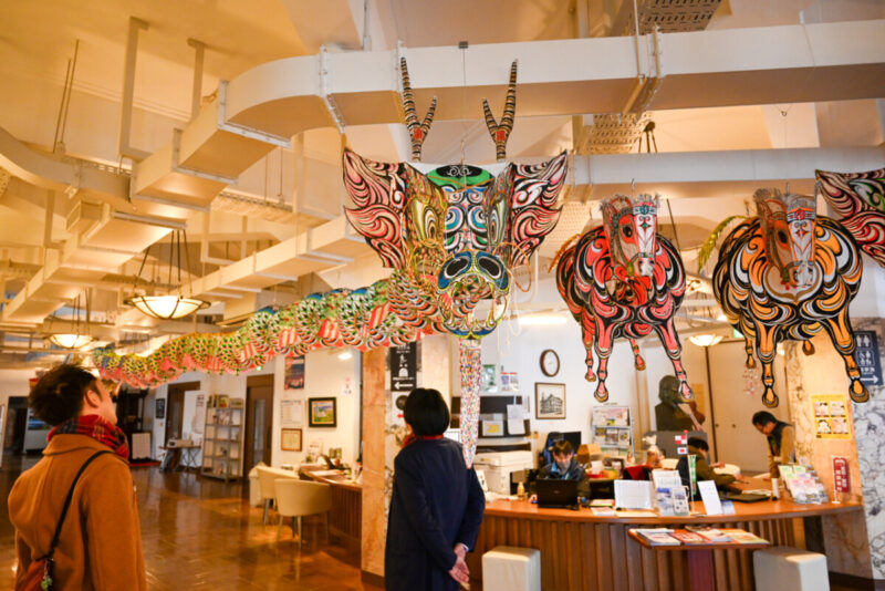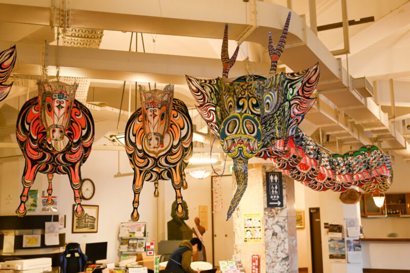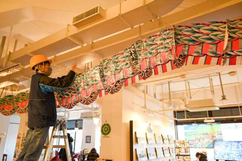 今回はインフォメーション前に梅谷さん製作の2体の龍の連凧を配置。間には2026年の干支・午(うま)も飾りました。ともに立体的で迫力があり、見ているだけで良い年を迎えられそうです。1階ギャラリー前には、旧西中校長で「はこだて日本の凧の会」を創設した故 秋山修世さん製作の凧も展示しています。