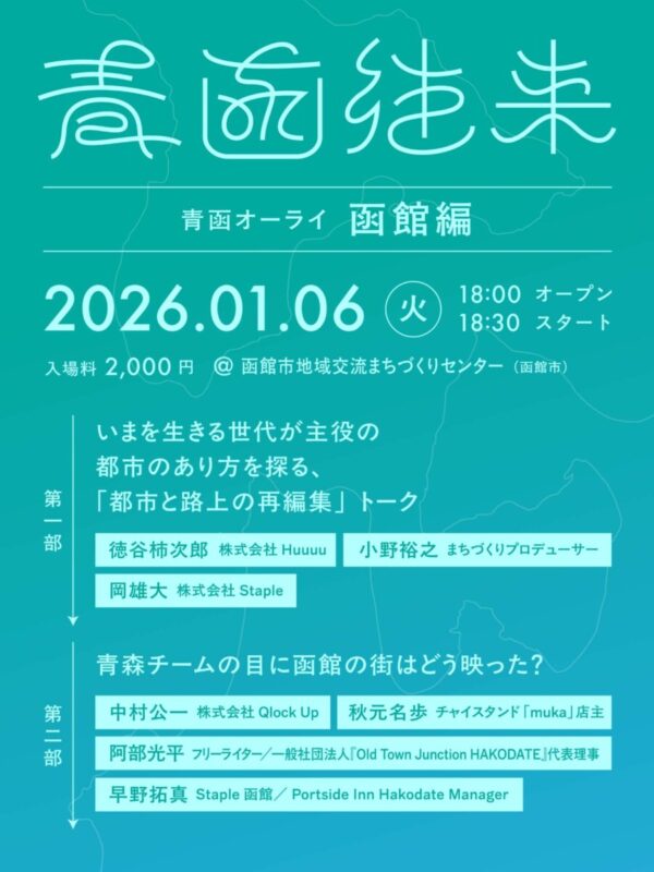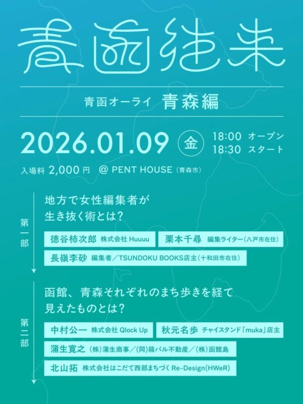 なお、「青函往来」青森編は1月9日(金)18時半より青森市にて開催されます。函館編に引き続き、青森・函館の各地で活躍する方々が登壇予定です。こちらもぜひご参加ください!