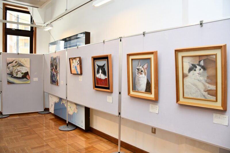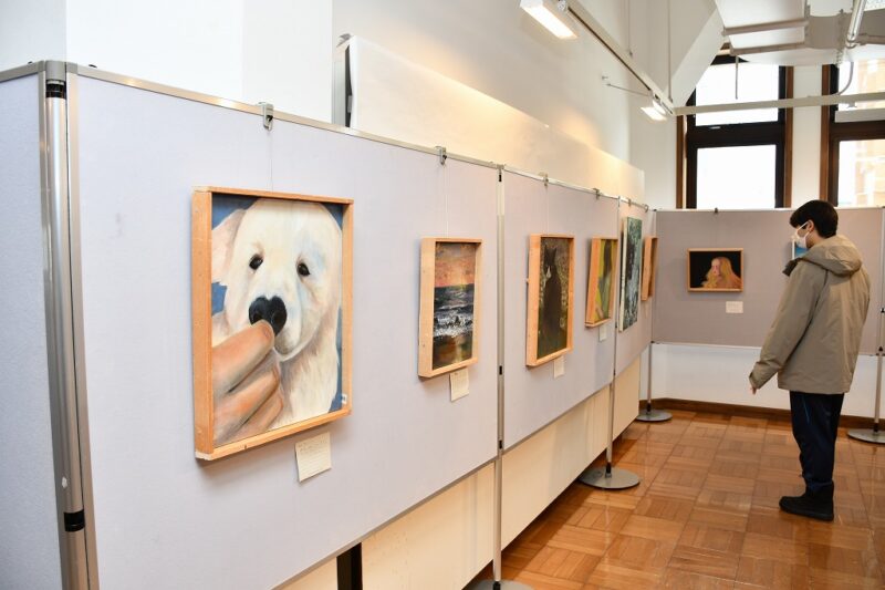 会場には、道南の高校9校(市立函館、中部、西、工業、大妻、八雲、七飯、江差、柏稜)の生徒たちによる絵画作品37点が展示されています。函館の風景や犬猫、人物画、抽象作品など、多彩なモチーフをさまざまな画風で表現した作品の数々に、じっくりと鑑賞する来場者の姿が多く見られました。
