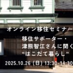 まちセン日記 2025年10月4日 2025年10月4日 まちセンスタッフ 【移住】「オンライン移住セミナー~移住サポーター・津熊智江さんに聞く“はこだて暮らし”~」を開催します!(2025.10.26) 函館市移住サポートセンターは、函館市への移住を検討されている方に、移住先としての函館の魅力を発信する「オンライン移住セミナー」を10月26日(日)13時半から14時半まで開催します。初回は函館市移住サポーターの津熊智江さ […]