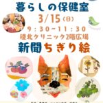 市民活動情報 2025年12月24日 2025年12月24日 まちセンスタッフ はこだて暮らしの保健室「新聞ちぎり絵」(2026.3.15) はこだて暮らしの保健室による「新聞ちぎり絵」が、2026年3月15日(日)に稜北クリニック2階広場にて開催されます!「はこだて暮らしの保健室」は、医師・看護師・リハビリ技師・栄養士など、あらゆるスタッフが街へ出てはじめた […]