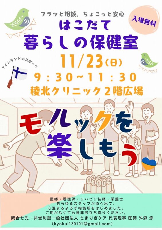 はこだて暮らしの保健室による「モルックを楽しもう」が、2025年11月23日(日)に稜北クリニック2階広場にて開催されます!