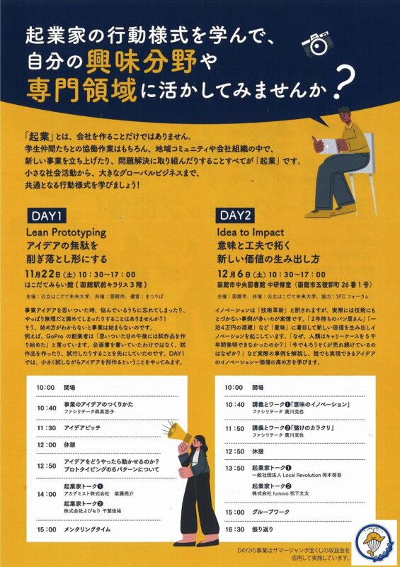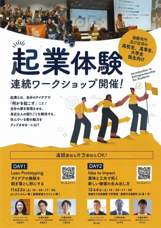 函館市と公立はこだて未来大学の共催による「起業体験 連続ワークショップ」が、11月22日(土)と12月6日(土)に開催されます!