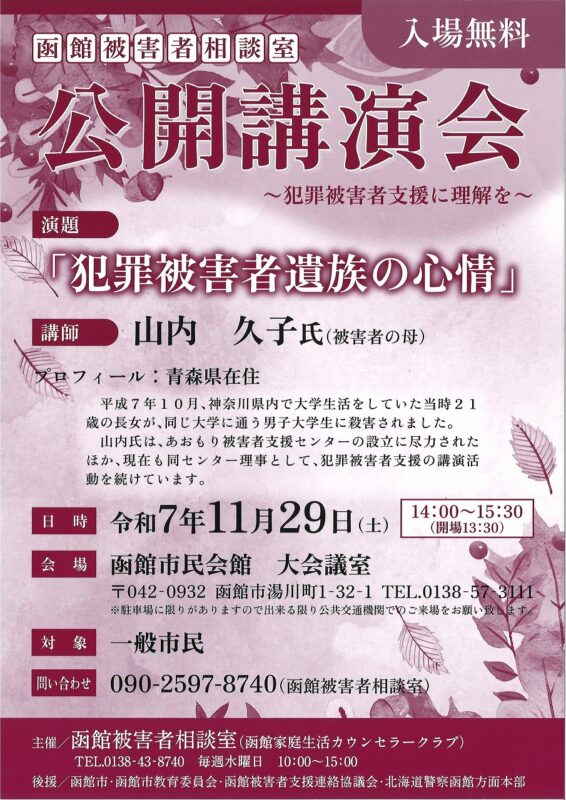 函館被害者相談室による公開講演会が、2025年11月29日(土)に函館市民会館 大会議室にて開催されます!