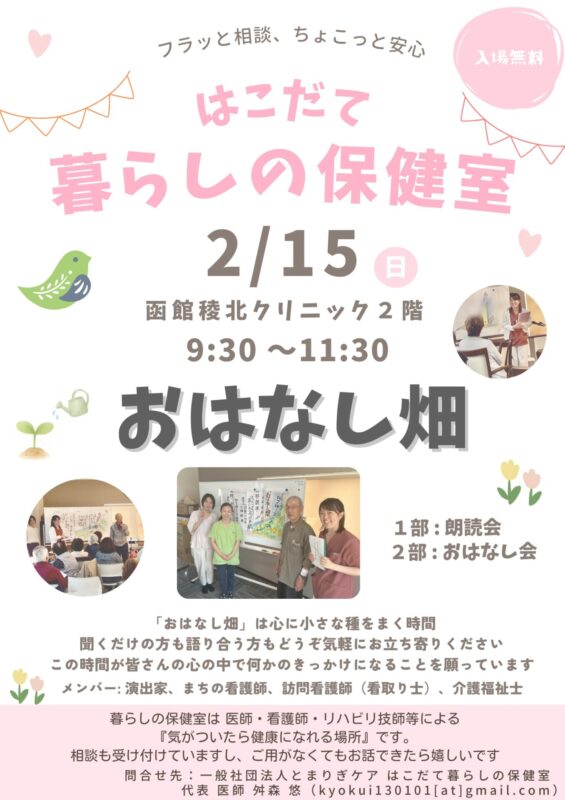 はこだて暮らしの保健室による「おはなし畑」が、2026年2月15日(日)に稜北クリニック2階にて開催されます!
