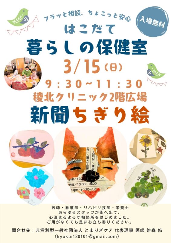 はこだて暮らしの保健室による「新聞ちぎり絵」が、2026年3月15日(日)に稜北クリニック2階広場にて開催されます!