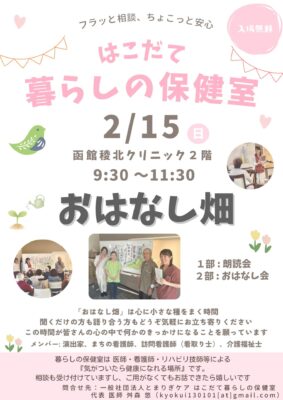 「はこだて暮らしの保健室」は、医師・看護師・リハビリ技師・栄養士など、あらゆるスタッフが街へ出てはじめたよろず相談所です。ご用がなくても是非お立ち寄りください。
