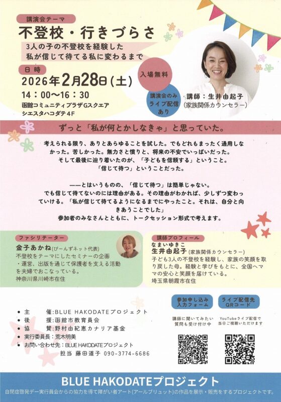 BLUE HAKODATEプロジェクトによる「不登校・生きづらさ」講演会が、2026年2月28日(土)に函館コミュニティプラザ Gスクエアにて開催されます!