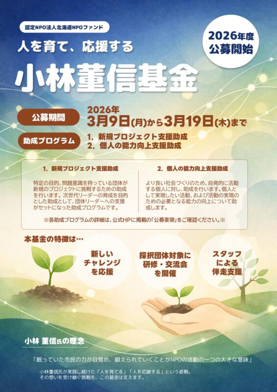 NPO法人北海道NPOサポートセンターの事務局を長きにわたり務められ、北海道のNPO活動の基礎づくりに多大な貢献をされた故・小林董信氏を偲び、その足跡と功績を後世に伝えるために基金を造成し、小林董信氏が実践されていた「人を育てる」「人を応援する」ことを目的とした助成を行います。
