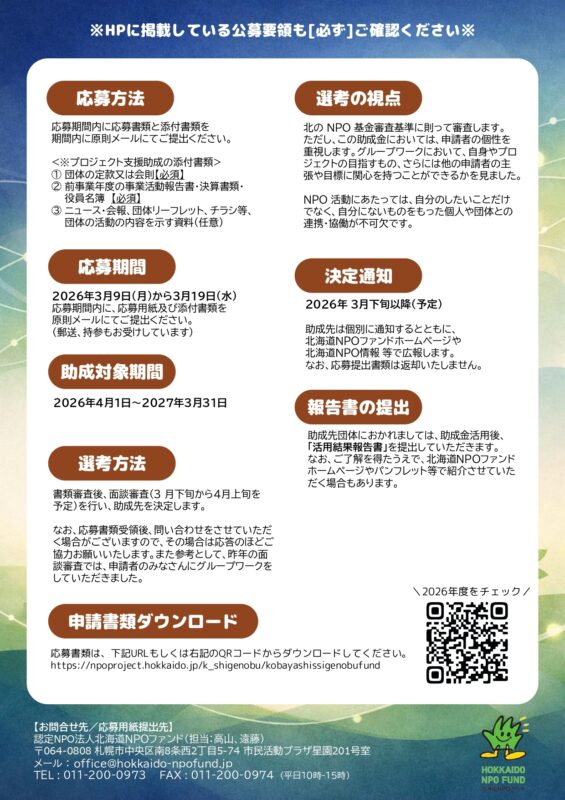 メール:office★hokkaido-npofund.jp(★⇒@に変えてお送りください)