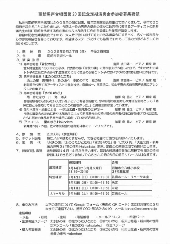 函館男声合唱団「函館男声合唱団第20回記念定期演奏会」(2026.9.27)
