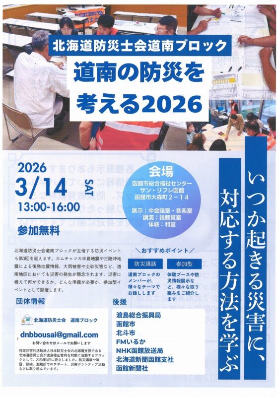 北海道防災士会道南ブロックによる防災イベント「道南の防災を考える2026」が、2026年3月14日(土)に函館市勤労者総合福祉センター(サン・リフレ函館)にて開催されます!
