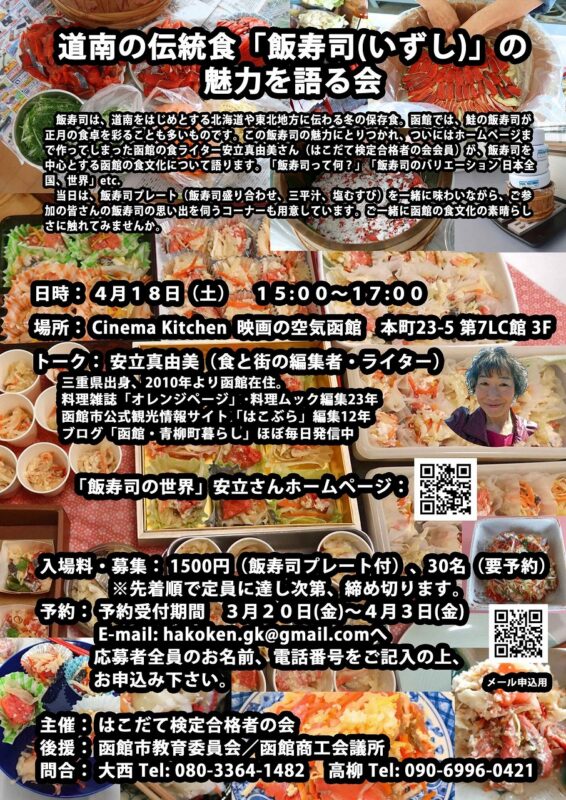 はこだて検定合格者の会による『道南の伝統食「飯寿司(いずし)」の魅力を語る会』が、2026年4月18日(土)にCinema Kitchen 映画の空気函館にて開催されます!